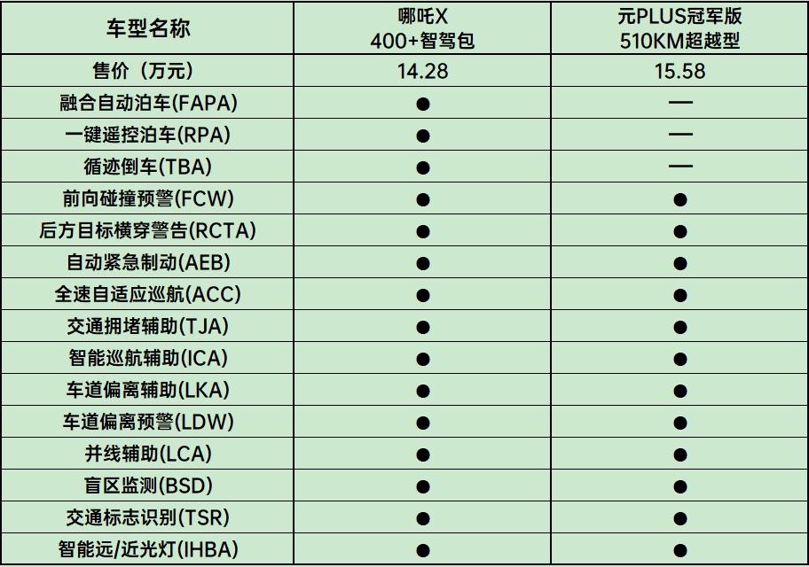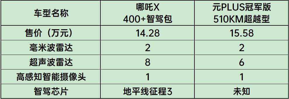 元PLUS冠军版在智驾能力上的对应版本,是售价15.58万元的「510KM超越型」,它配备了2颗毫米波雷达,6颗超声波雷达,1颗高感知摄像头,不过智驾芯片并非公布。从硬件条件上看,哪吒X更强一些。