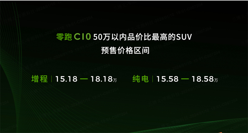 1月10日,2024零跑全域自研开放日暨C10预售发布在杭州举行。零跑C10正式开启预售,增程版预售价格区间为15.18-18.18万元,纯电版预售价格区间为15.58-18.58万元,预计3月正式上市并批量交付。