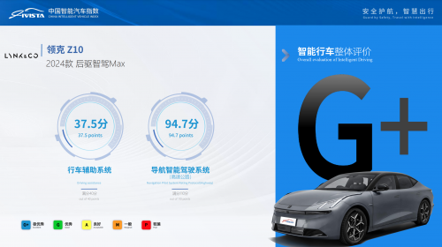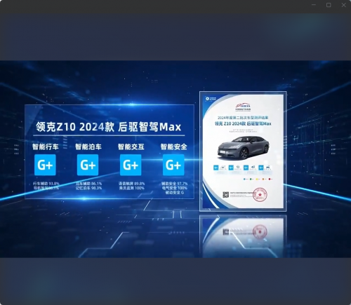 【2025年1月14日,杭州】领克Z10以其同级领先的性能和先进的智能科技,荣获中国汽研IVISTA智能汽车指数的4G+成绩,成为首批在中国汽研IVISTA的测试中,获得4G+成绩的智能轿车,充分展现了领克Z10在智能汽车领域持续进阶的实力,为用户带来了更便捷智能的出行体验。中国汽研是国家一类科研院所,也是行业权威的汽车测试机构之一。此外,它更是全球首个专为消费者打造的公平、公正、专业且权威的智能网联汽车第三方测试评价体系——IVISTA中国智能汽车指数测评的创立者。该测评体系涵盖了智能行车、智能泊车、智能交互以及智能安全等四大核心测试项目,测试标准严苛且全面。在如此高标准的测试环境下,领克能够斩获4G+的优异成绩,这充分证明了领克在智能化领域持续发力并取得了显著成效。