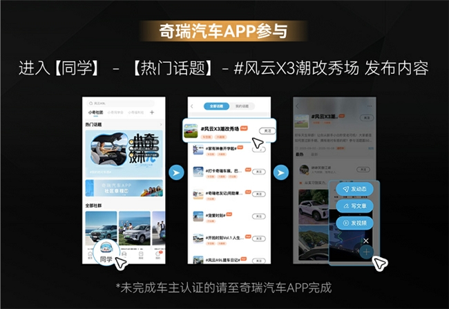本次的“风云X3潮改秀场”活动,开通了“实车改装派”与“创意设计派”两类参与形式,致力让更多的奇瑞用户参与进来,助力中国方盒子更好发展。