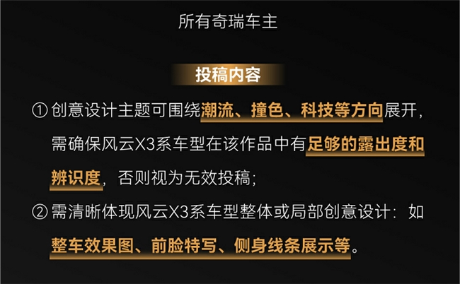 “创意设计派”赛道除了面向风云X3系列车主,奇瑞汽车的所有车主均可参与,用自己的创意热忱,驰骋对风云X3系列的无尽想象。